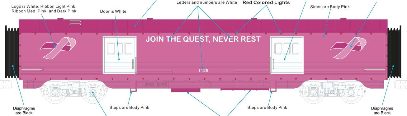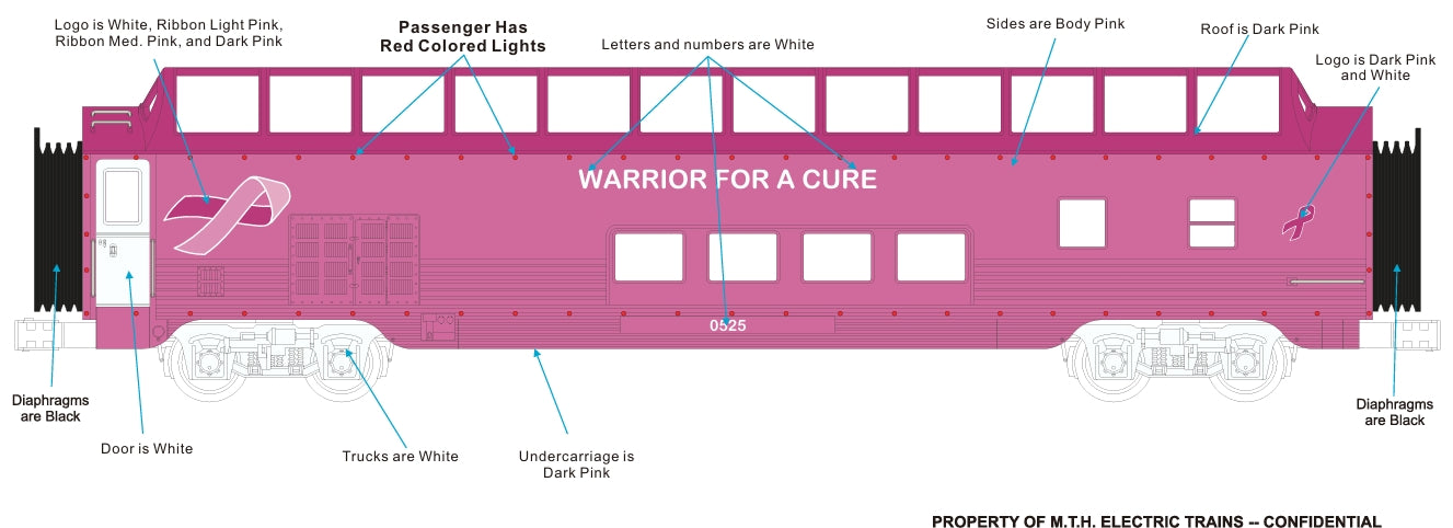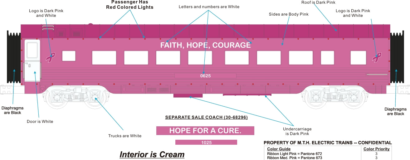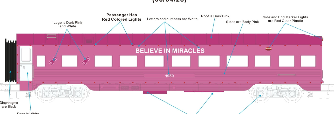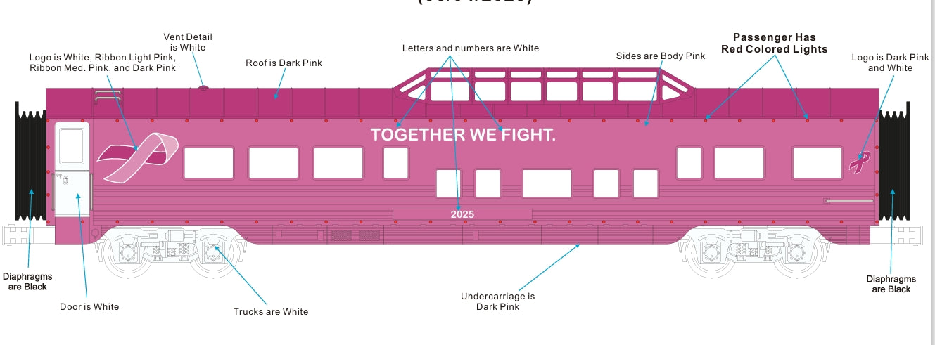 ETA DECEMBER 2025 ( MTH CUSTOM RAILKING CANCER AWARENESS SIX CAR PASSENGER SET WITH RED LED LIGHTS